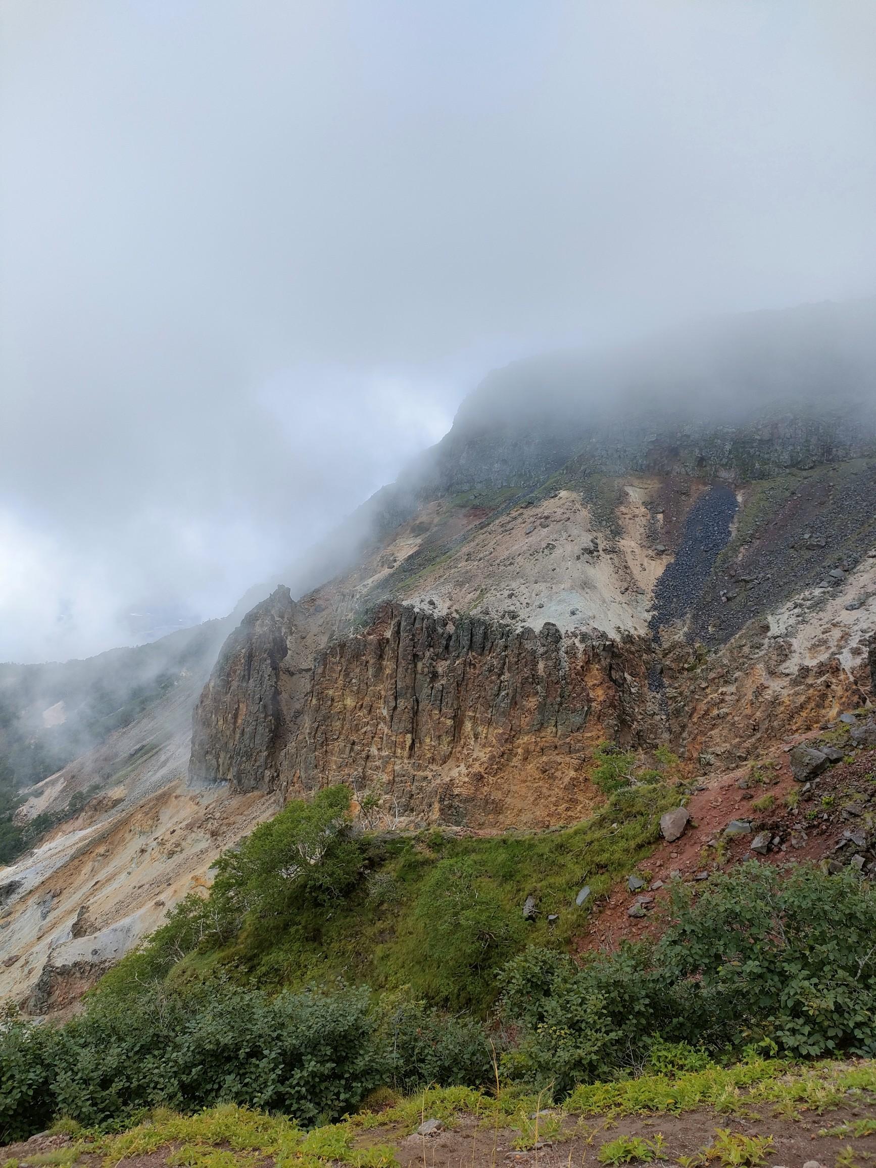 山頂に近づくと爆裂火口🌋が見えてくる。雲があり火口の真下までは見えないが